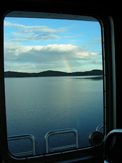 Sept 14. It was raining early but slowly cleared. The honeymooners said goodbye and headed off down the bay for more adventures. We headed into Castine for groceries and lunch at our favorite place BAH’s and had our favorite tomato cognac soup. The sun was warm and the day clear for a while but later, a quick thunderstorm came through- nap time. I got up because I had cooking to do for Chris, Corey and company who were coming the next day. As I stood at the sink, I noticed a rainbow out the window and a few minutes later, six loons floated by out in the bay! Not all bad scenery- that’s Maine for you.